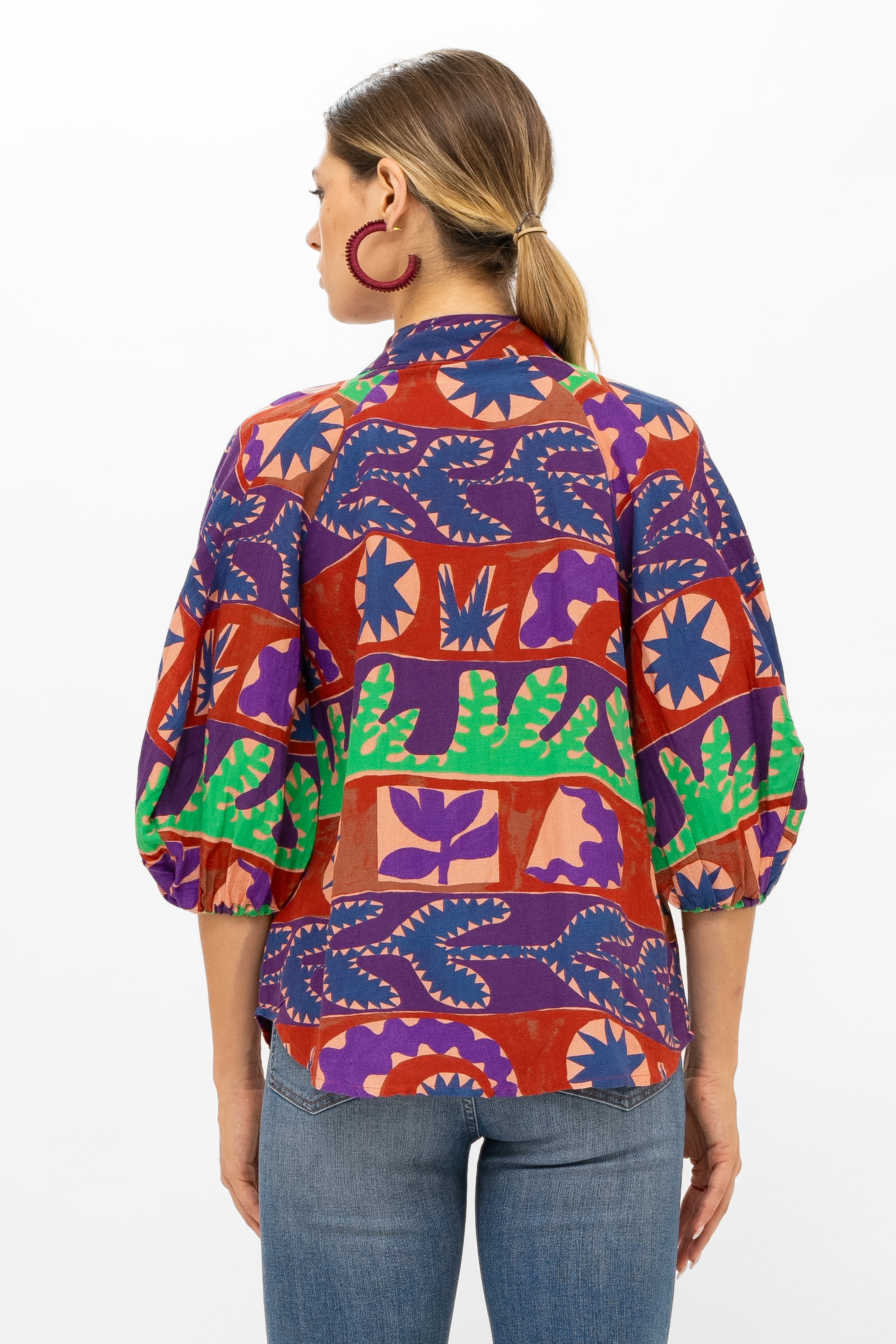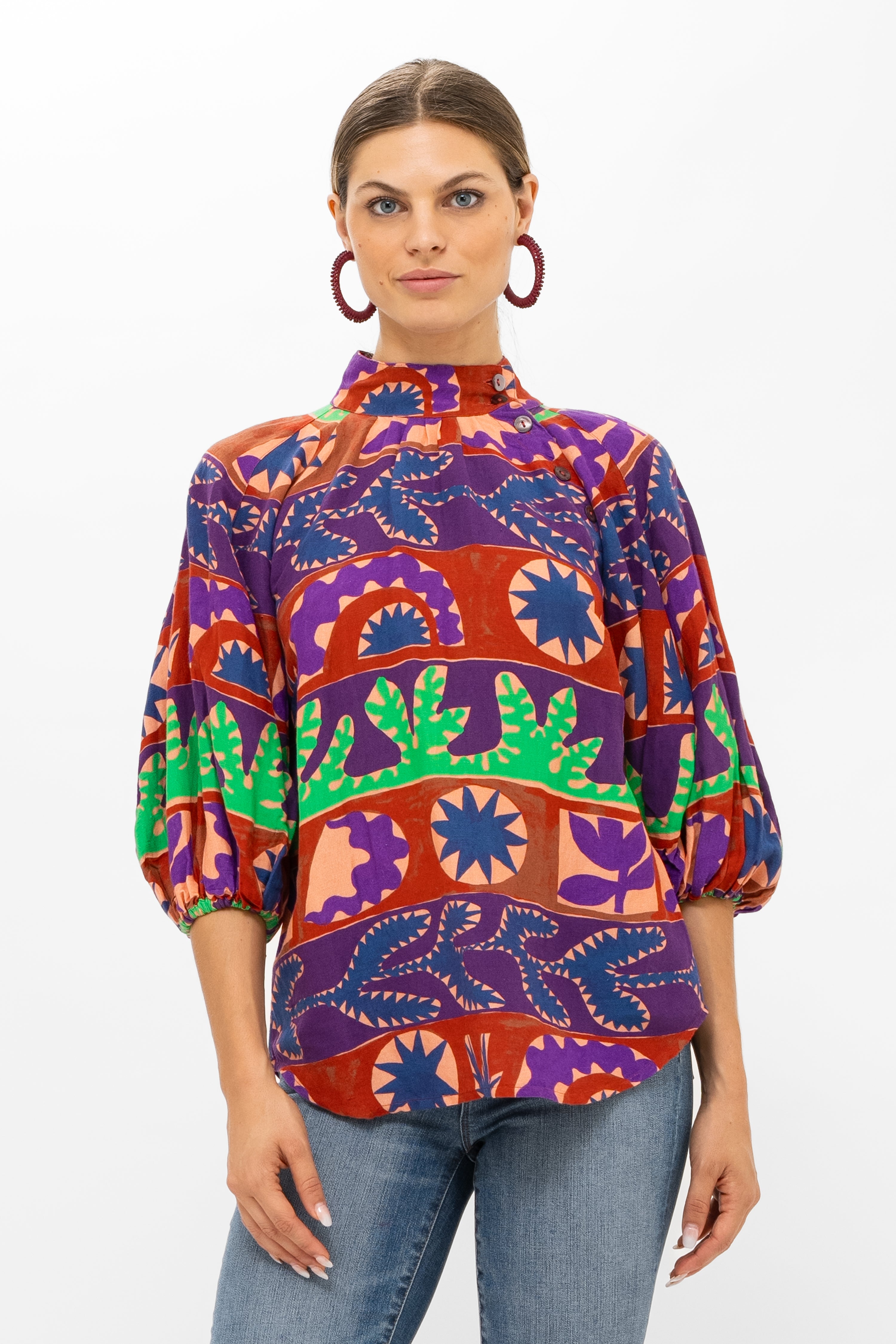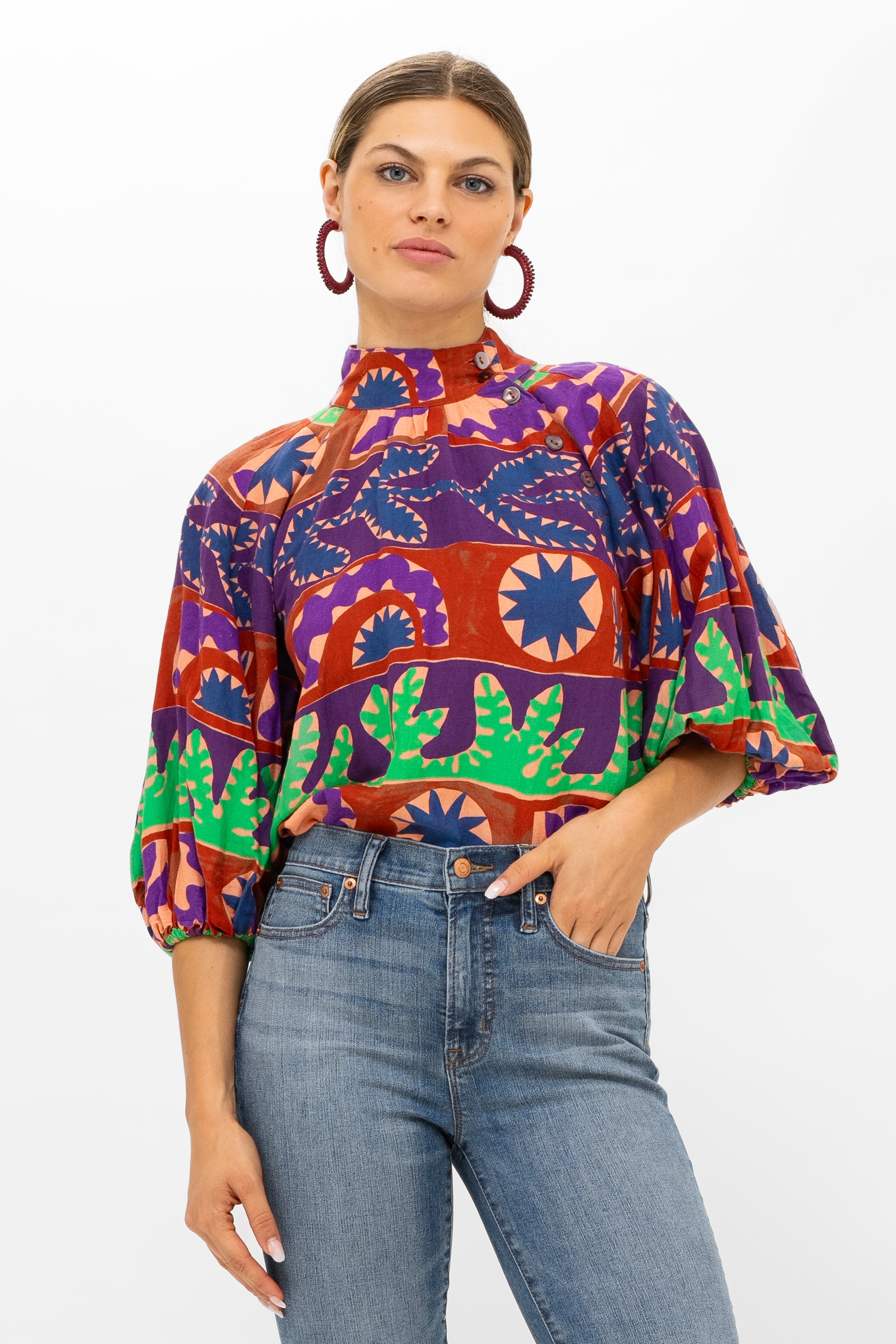 - Asymmetrical button detailing along neckline