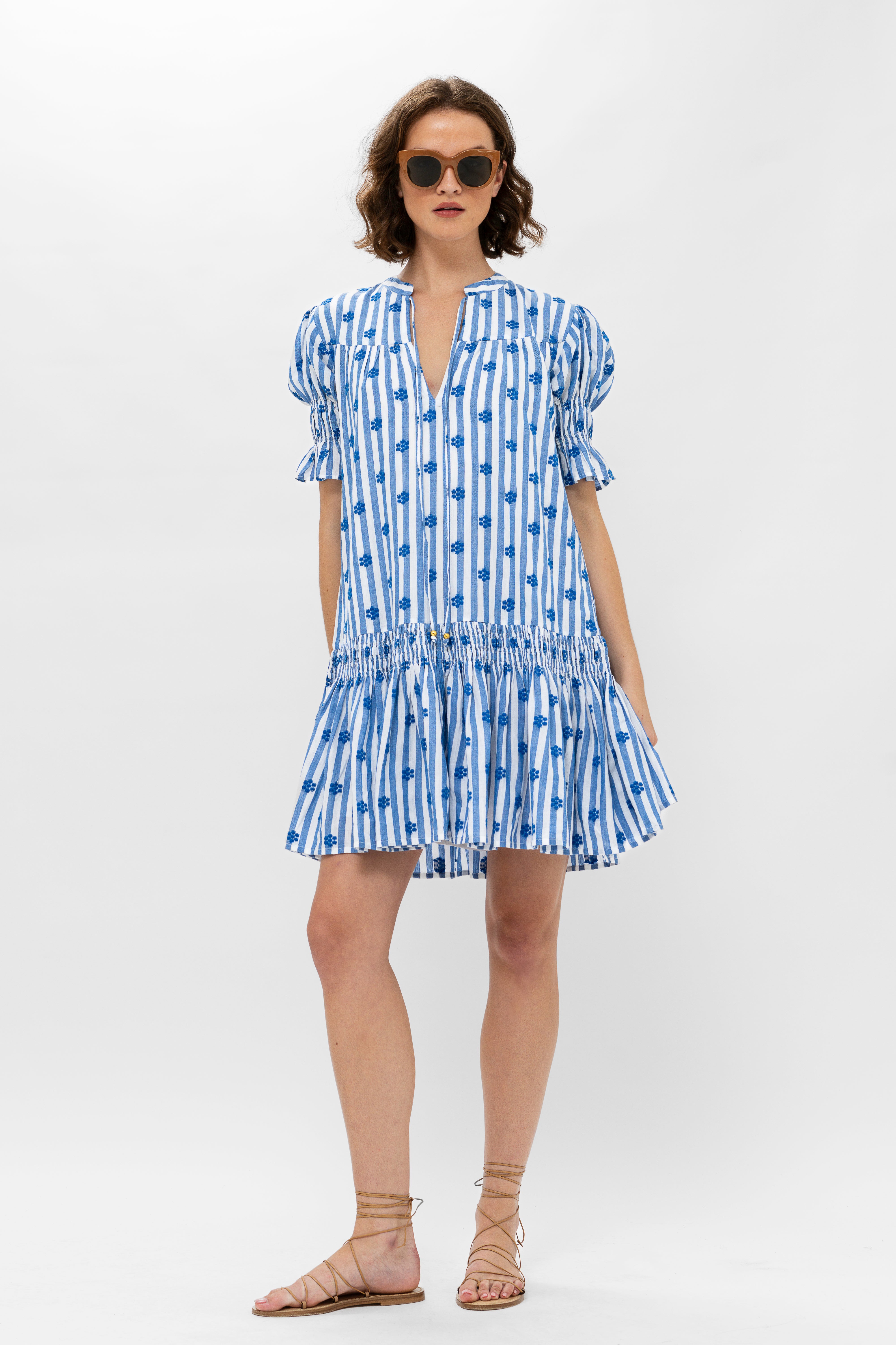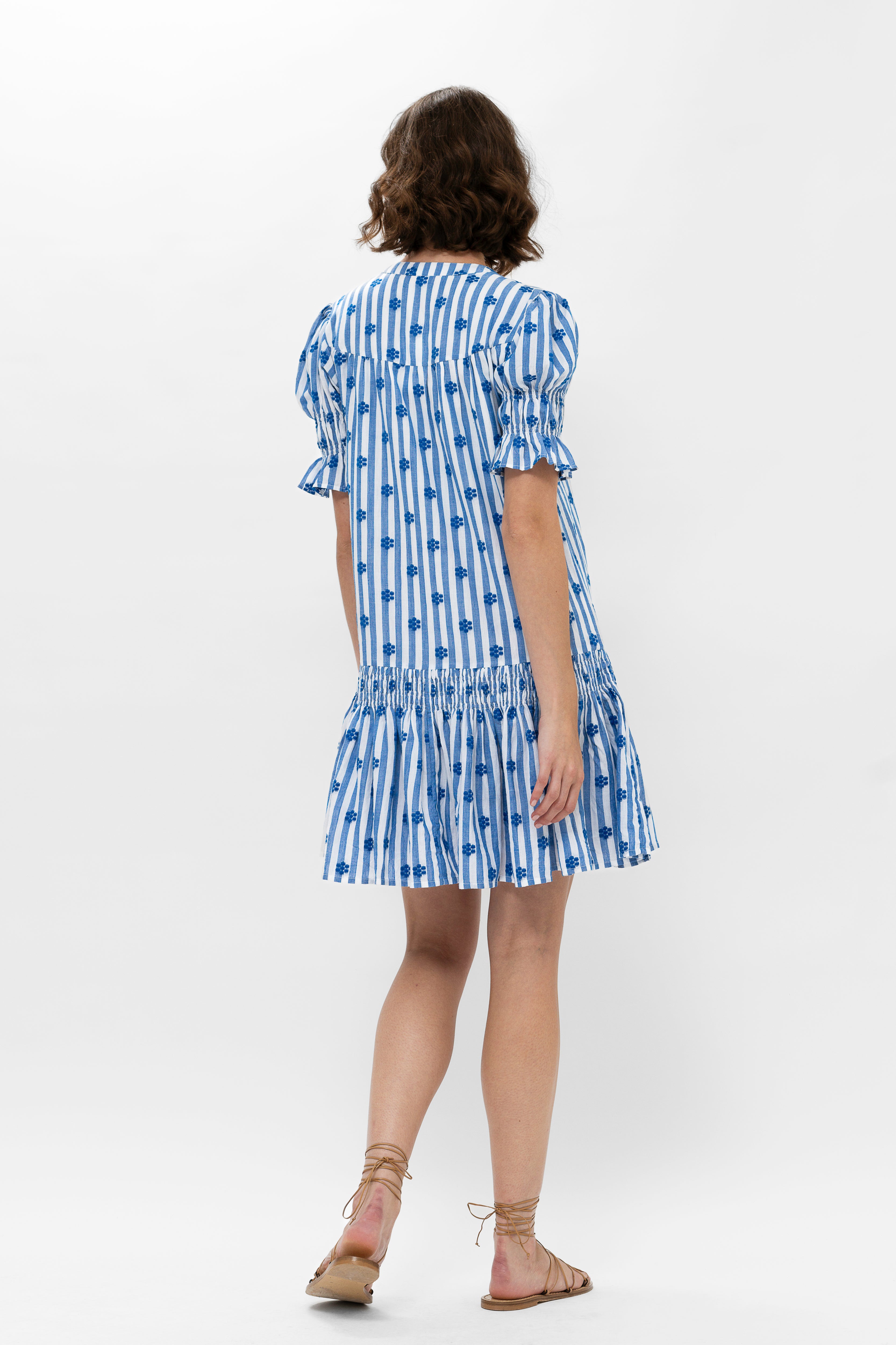 - Decorative smocking around the skirt