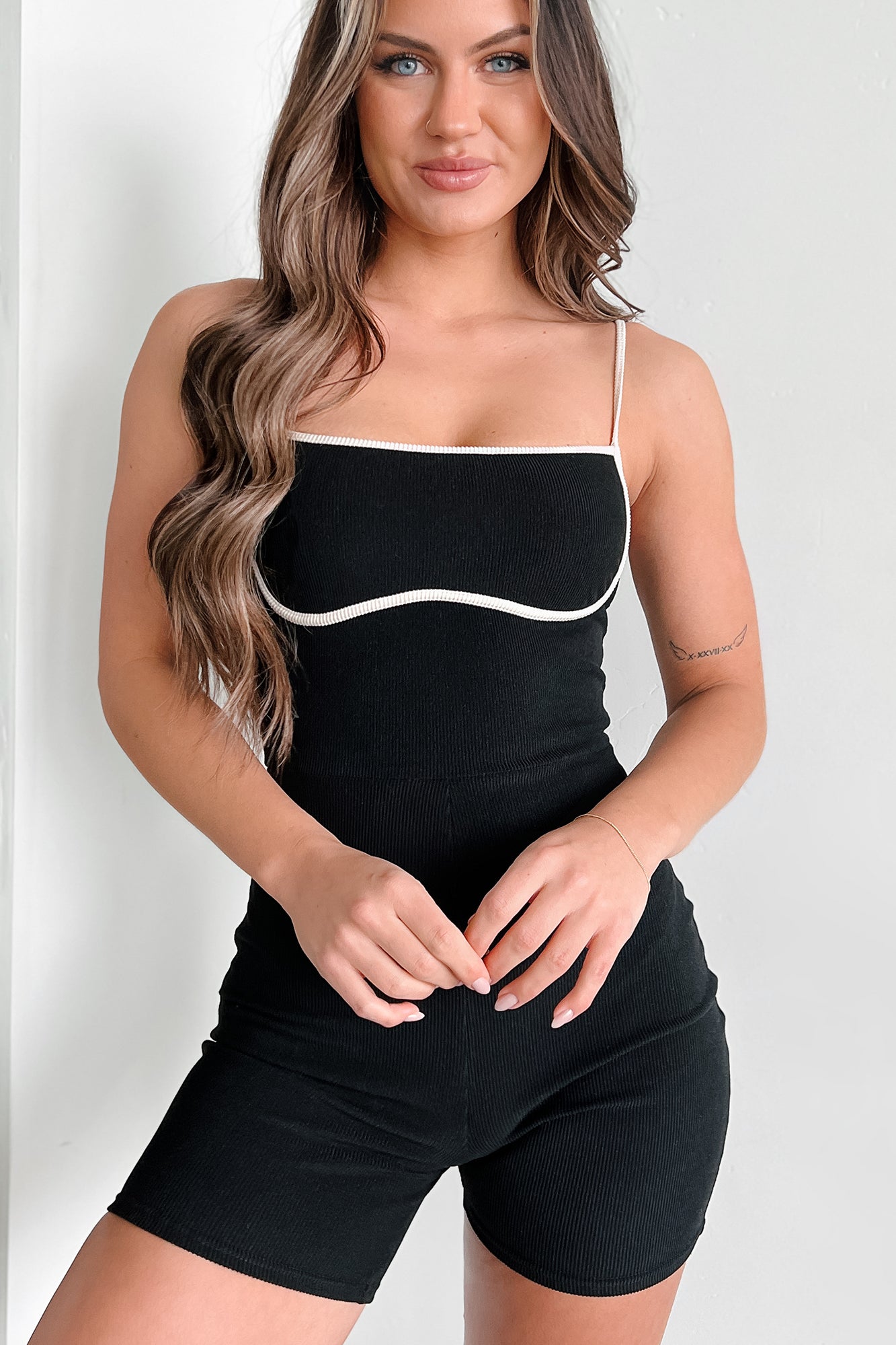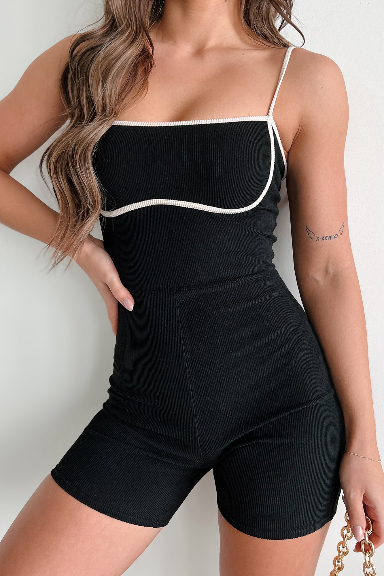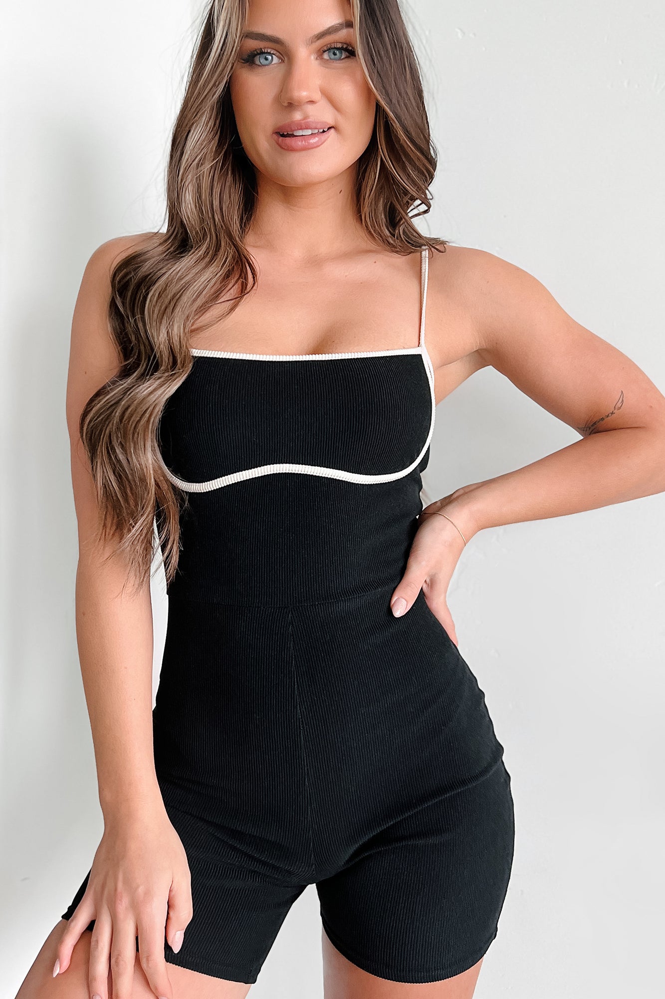 Chic Alternative Ribbed Contrast Seam Romper (Black/Cream)