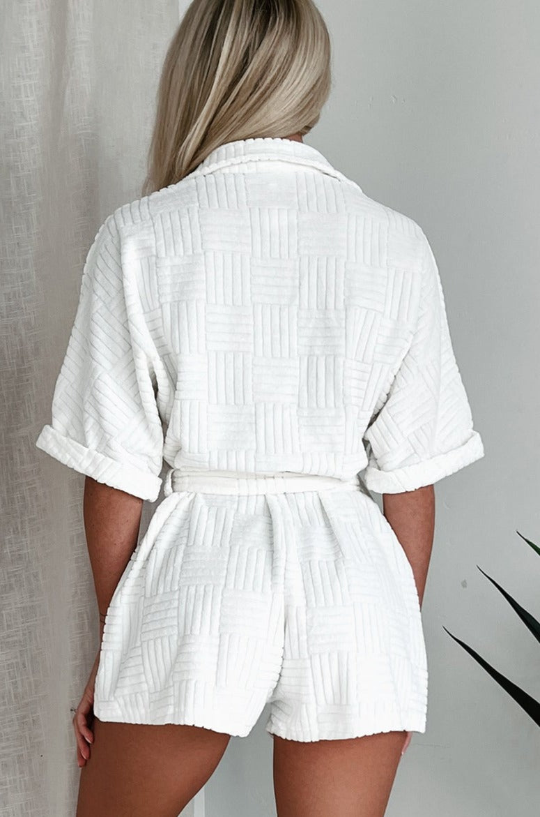 Praying For Sunshine Belted Terry Cloth Romper (White)