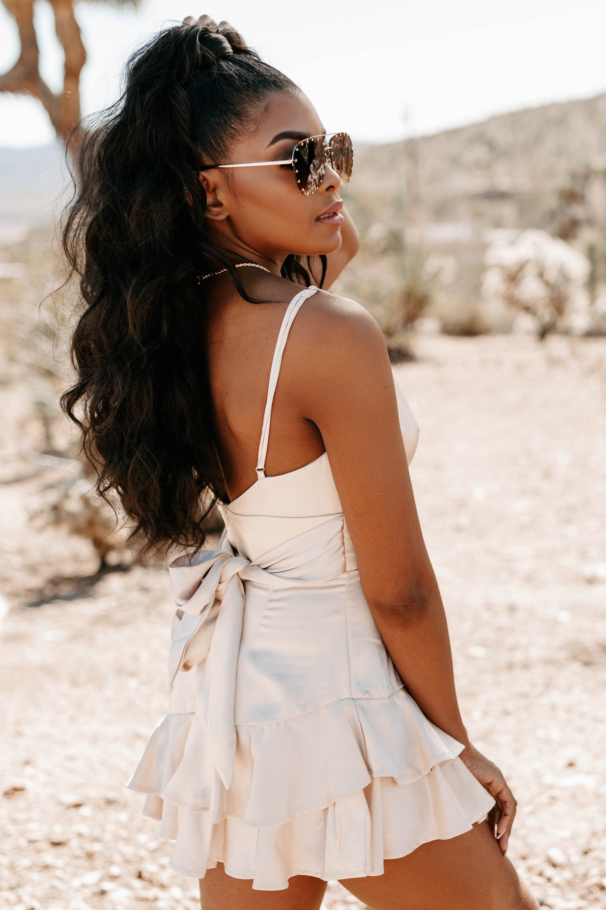 Flatter Me Satin Ruffle Romper (Champagne)