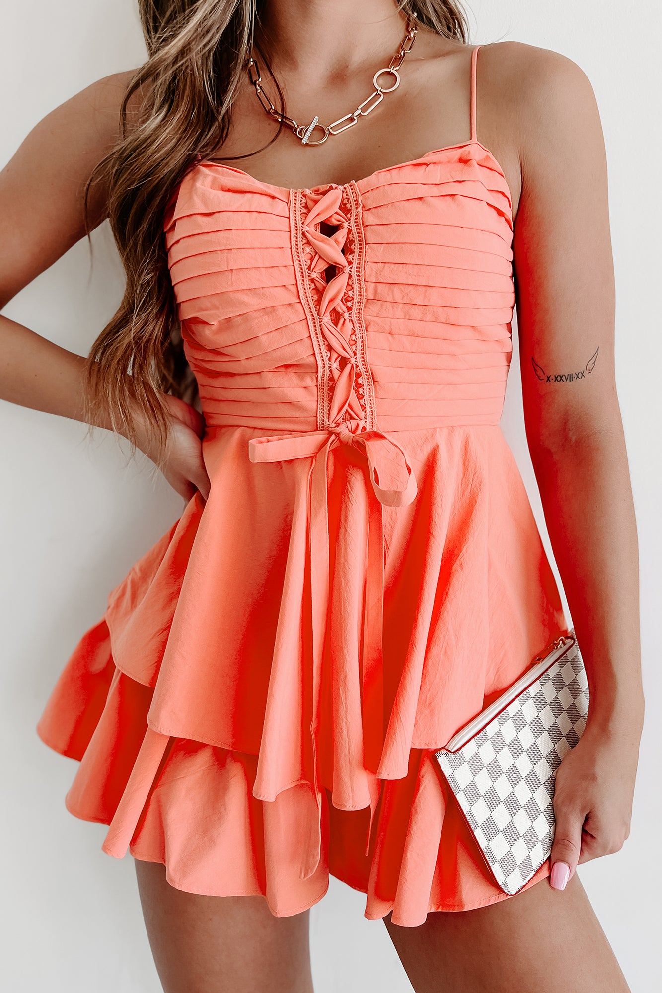 Peachy Keen Pleated Ruffle Romper (Coral)