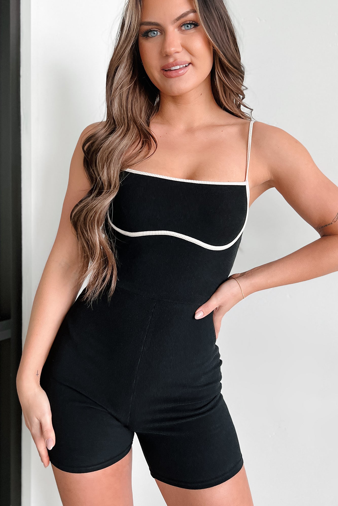 Chic Alternative Ribbed Contrast Seam Romper (Black/Cream)