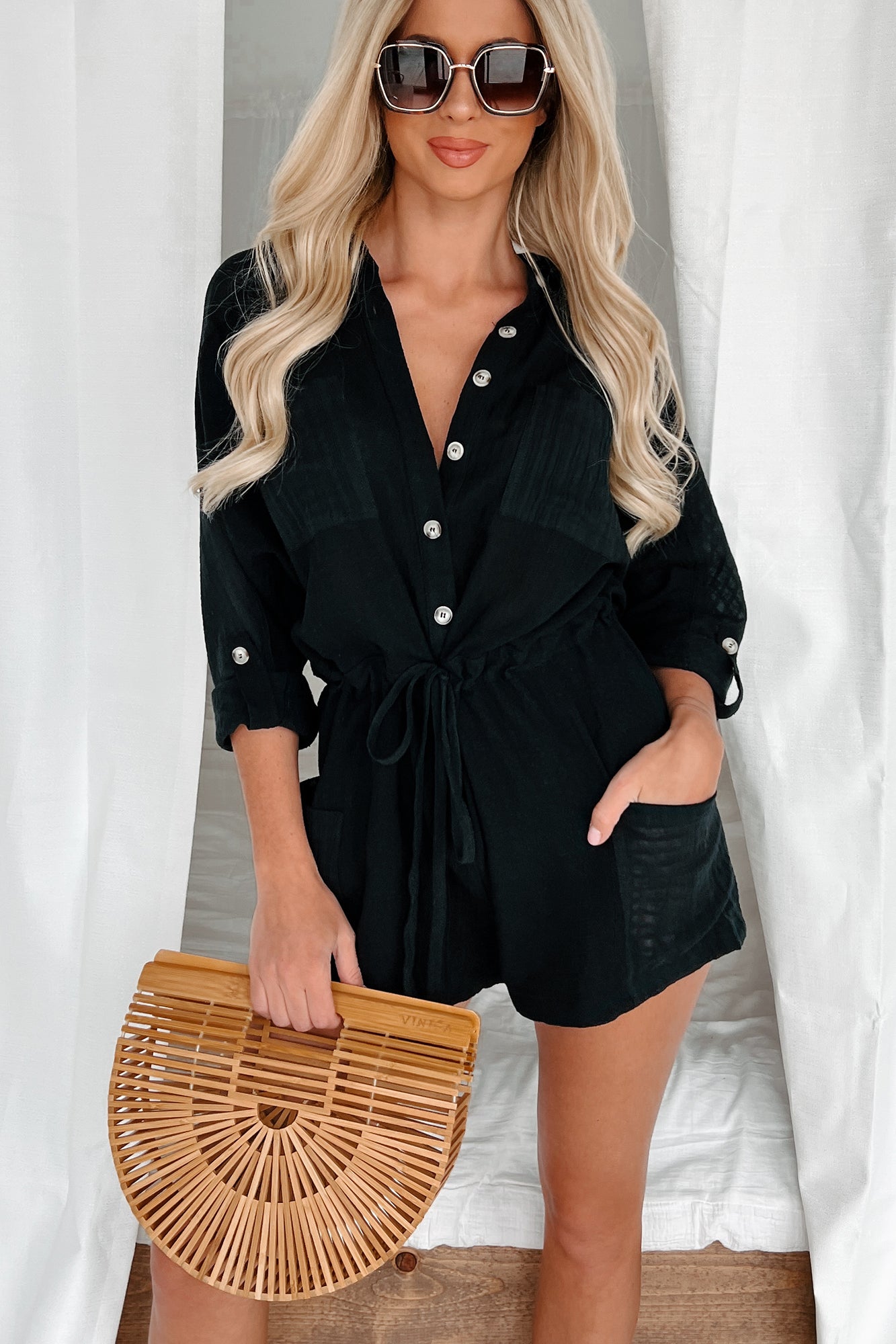 Kallie Linen Drawstring Waist Romper (Black)