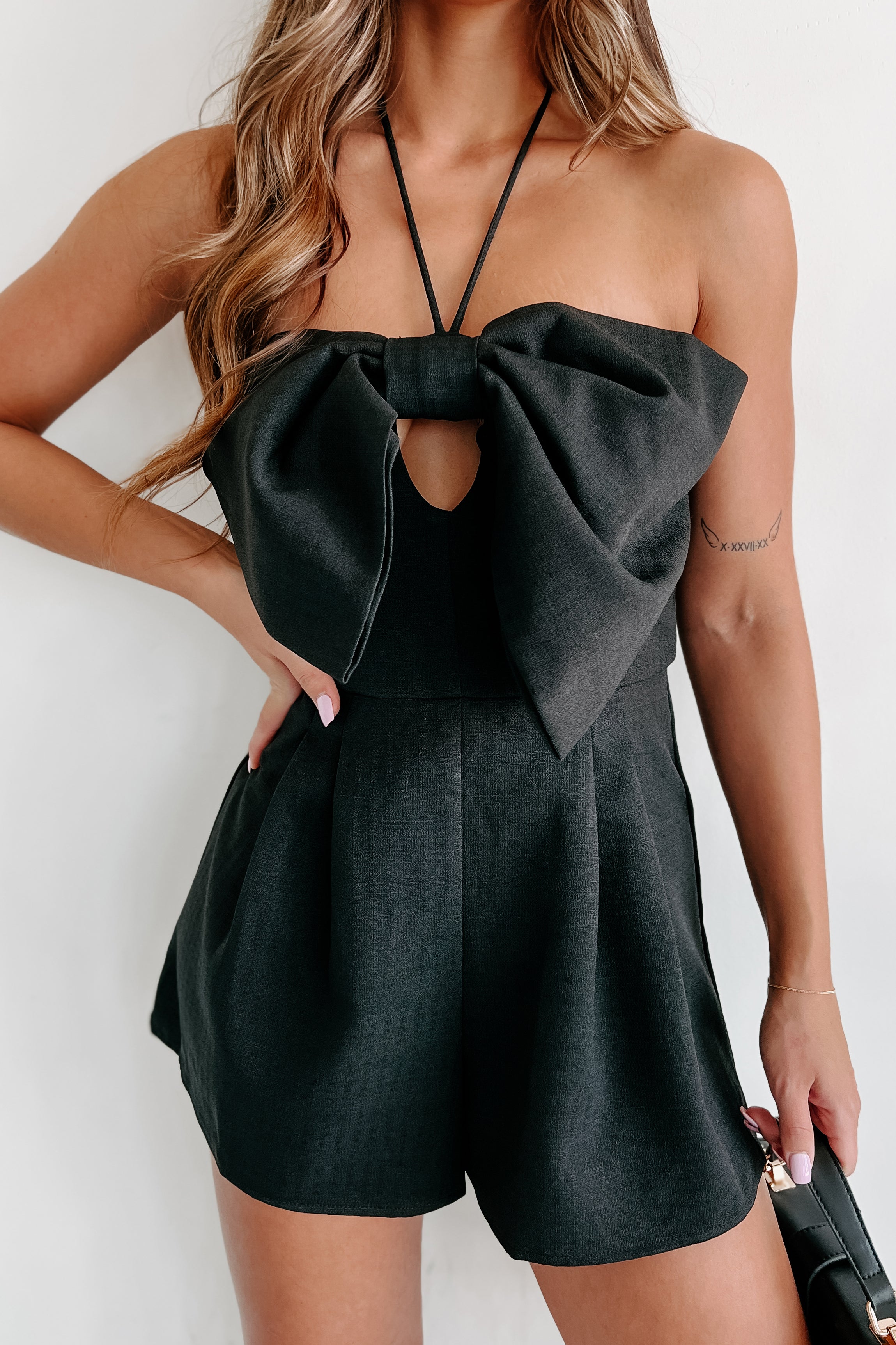 Mysterious Admirer Bow-Front Halter Tie Romper (Black)